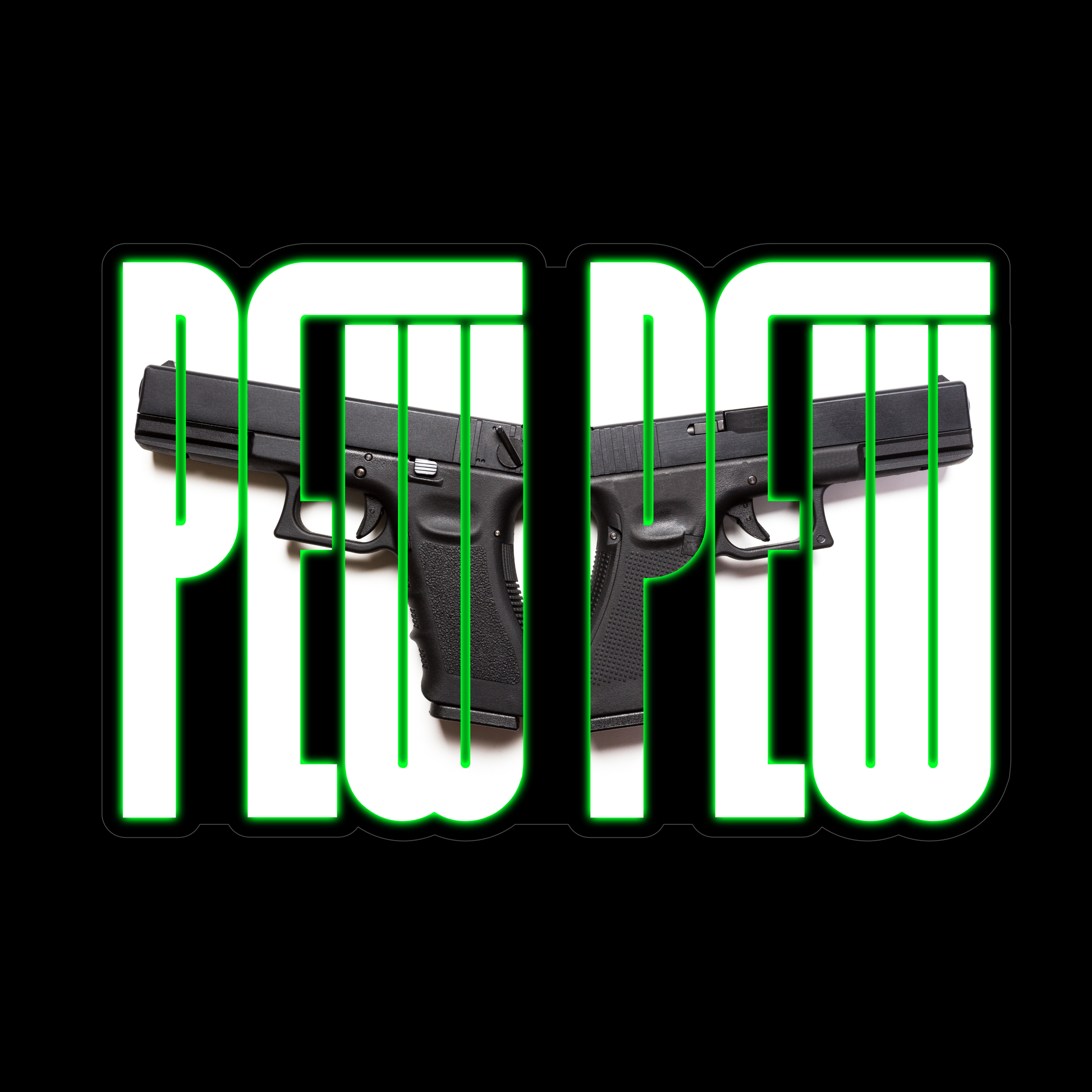 Dieses knallige Neon-Meisterwerk bringt den ultimativen Action-Vibe in deine vier Wände. Mit dem legendären "PewPew" in leuchtenden Neonfarben und zwei Glocks, inklusive der legendären Glock 18, wird dein Gaming-Room, Mancave oder Partyraum zum absoluten Hingucker.