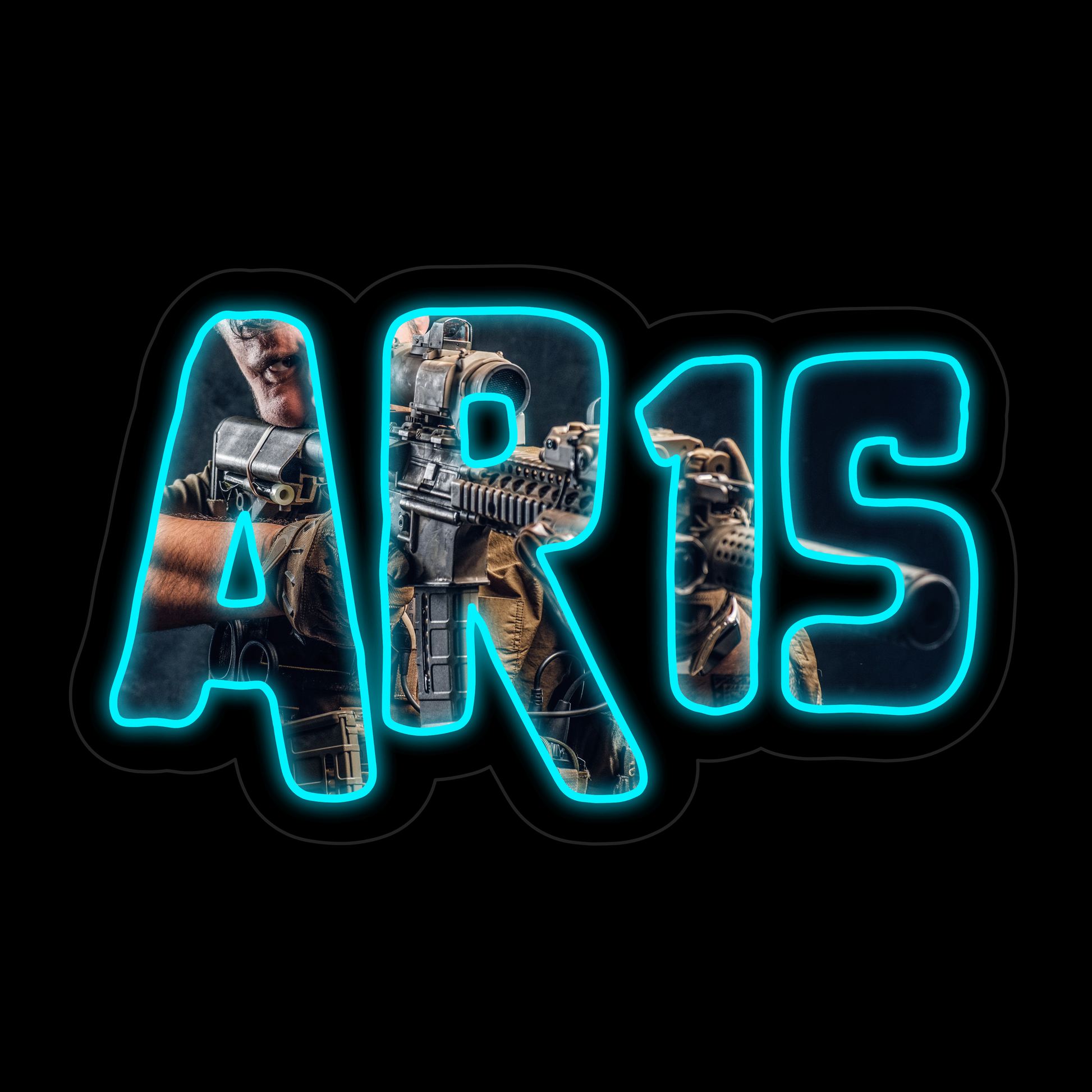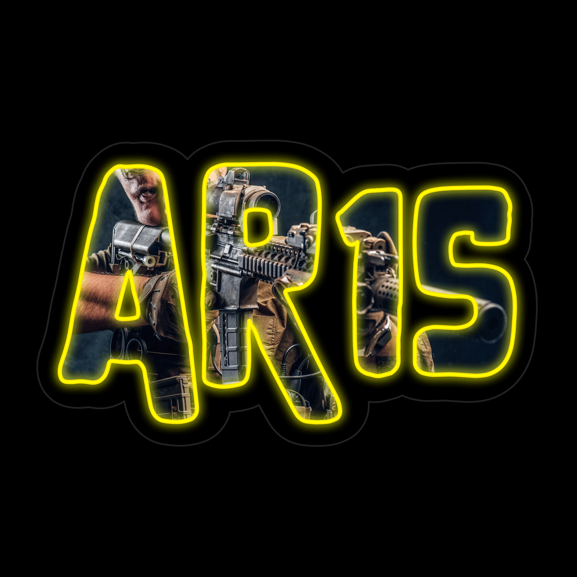 Dieses knallige Neon-Kunstwerk bringt den ultimativen Tactical-Shooter-Vibe an deine Wand. Mit leuchtenden Neon-Konturen einer ikonischen AR15 und einem Action-geladenen Schützen.