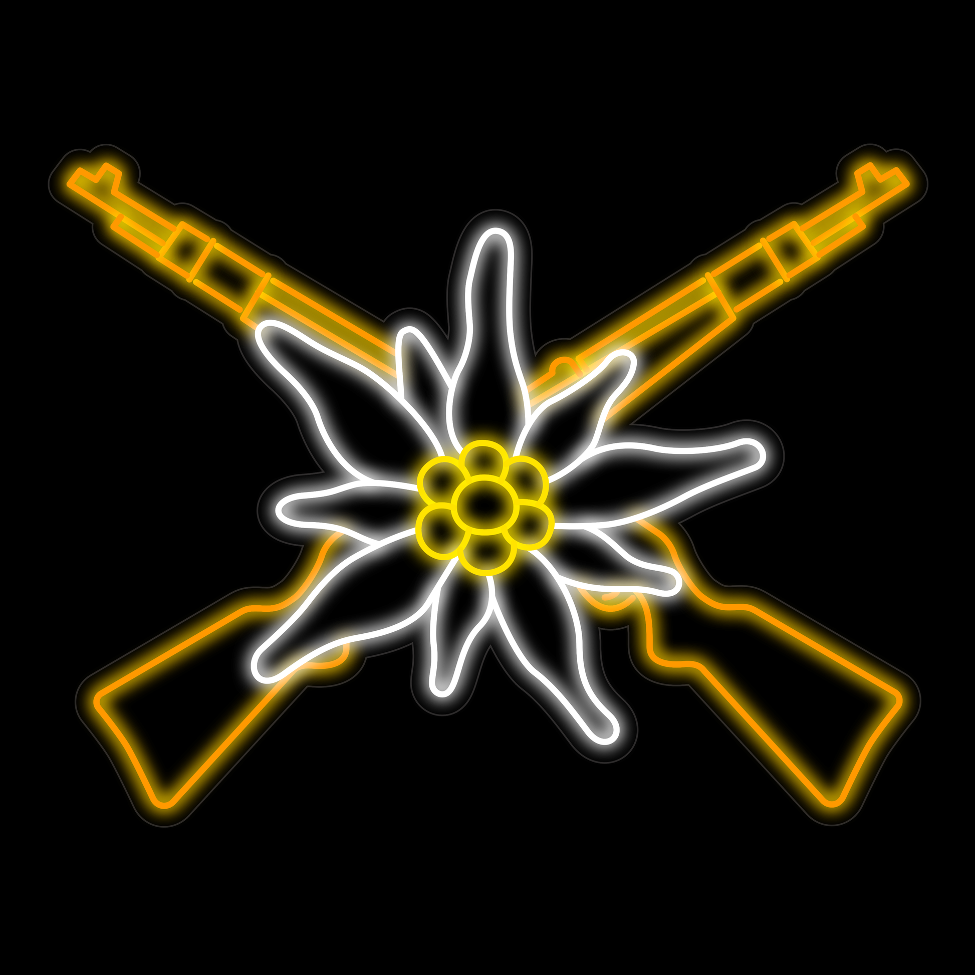 Dieses wunderschöne Neon-Kunstwerk vereint zwei ikonische Symbole der Schweiz: Die legendären K31 Karabiner, die stolze Geschichte des eidgenössischen Militärs, und das zarte Edelweiss, die Königin der Alpenblumen. In leuchtenden Gelb- und Weiss-Tönen erstrahlt diese traditionelle Komposition als moderne Kunst.